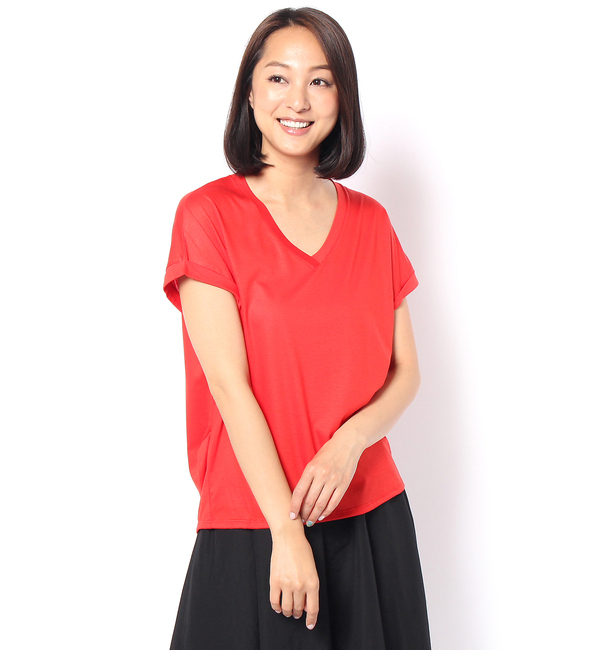 【送料無料】 リヨセルと綿の混合で程よい光沢のあるVネックTシャツです。さらりとした肌ざわりとしわになりにくさ、風通しが良く心地よいのが魅力。半そでの袖口はロールアップされていてワンポイントになります。インナーとしてもメインとしても一年中通して着られる、一枚持っていると便利なアイテム。 リヴドロワ/RIVE DROITE トップス|Tシャツ・カットソー