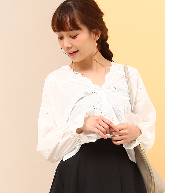 幾何柄パンチングレースボリューム袖ブラウス