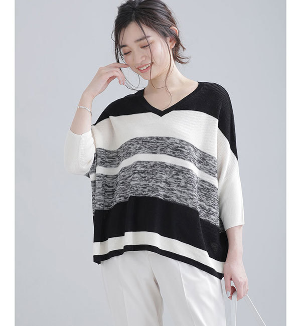 【送料無料】 ■ポンチョ風のデザインが可愛い■春らしい素材感で仕立てた新作ニットプルオーバーが登場。人気の片畦編みをリネン混の素材で涼しげに仕立てた春仕様のひと品。ポンチョのようなシルエットで袖口には長めのリブを配すことで引き締めたデザインが特徴的。変則的なランダムピッチで編んだボーダーは着るだけで一気にトレンドライクな雰囲気を演出してくれます。ゆったりシルエットで華奢見えが期待できる片落ちデザインとゆったりフォルムで華奢見えを叶えてくれる一枚。程よく開いたVネックの首回りで抜け感を演出し、重々しくならないのも嬉しいポイント。軽快な色使いが涼しげなブルーと、都会的なブラックの2色をご用意。テイパードパンツやタイトなデニムを合わせシルエットに変化をつけた着こなしがオススメです。model: H168cm 着用サイズ: FREE■商品特性■透け感:なし生地の厚さ:普通裏地:なし伸縮性:ややあり光沢:なしシルエット:タイト■洗濯表示■家庭での洗濯禁止塩素系及び酸素系漂白剤の使用禁止タンブル乾燥禁止底面温度110℃を限度としてアイロン仕上げができる石油系溶剤による弱いドライクリーニングができるウェットクリーニング禁止 ナノ・ユニバース/nano・universe nano・universe Ladys|トップス|ニット・セーター