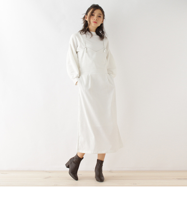 【送料無料】 バックシャーリングで、フィット感を高めたジャンパーワンピース。フロント部分はV字にする事で、シャープに印象つけつつインナーを適度にアピール。スッキリとした装いへと導くストライプ柄で、幼くなりすぎない1枚です。モデル情報:身長170cm B80 W60 H87 着用サイズ:38(M)店舗へのお問い合わせ商品番号:162-54001主に春に着用いただける商品です。 中国製 オゾック/OZOC OZOC|ワンピース|ワンピース