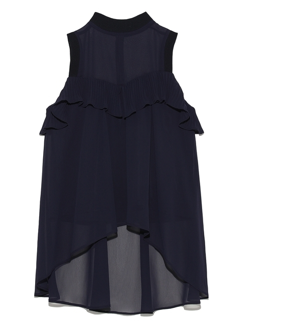 【送料無料】 繊細に揺らぐ、胸元のフリルが可憐なノースリーブプルオーバー。デコルテ部分は透かせながらハイネックをリブ地で仕立てた、ニュアンスある肌見せのアイテムです。ヒップを長めにデザインしたヘムは、ボディラインをカモフラージュしたいときにも活躍。※商品画像はサンプルのため、色味やサイズ等の仕様に変更がある場合がございますので、予めご了承ください。 スナイデル/snidel snidel|トップス|プルオーバー