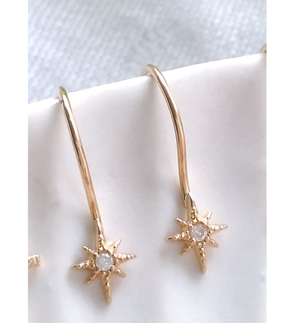【送料無料】 大人の女性が楽しめるスターモチーフピアス。耳もとから流れるようにダイヤが輝くデザインが魅力的。程よい大きさなので、どんなスタイリングにも寄り添ってくれます。ミル加工を施したスターモチーフはマットな質感で大人な輝きを楽しめます。 ※太陽光は変色の原因となりますので、直射日光の当たらない場所での保管をお願い致します。ダイヤモンドには多少のインクルージョン、クラックがございますのであらかじめご了承ください。 ノワール ド プーペ /NOIR DE POUPEE アクセサリー ・ヘアアクセサリー|ピアス