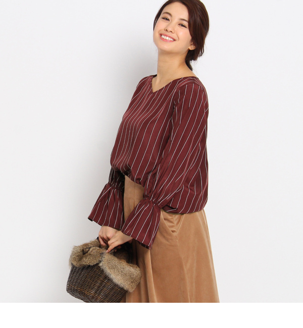 【送料無料】 Wストライプを描いたジョーゼット生地の秋冬らしいシックムードが魅力の袖コンシャスブラウスです。色・柄でトラッドムードを薫らせつつ、カラーリングギャザーからひらっと広がるスリーブシルエットが、レディな旬気分をひと匙プラス。Wストライプのマニッシュさゆえに、“袖ひら”がフェミニン一辺倒にならずクールにみえるのも魅力です。モデル情報:身長167cm B79 W55 H88 着用サイズ:02(M)店舗へのお問い合わせ商品番号:F58-83026主に秋に着用いただける商品です。 中国製 デッサン/Dessin Dessin|トップス|シャツ・ブラウス