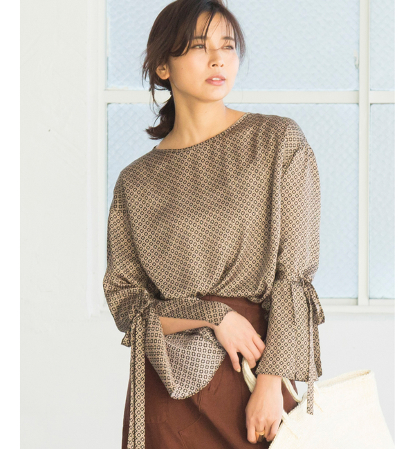 【送料無料】 モロッコのモザイクタイル柄を思わせるような、丸い幾何柄のオリジナルプリントを施した袖コンシャスなブラウス。シルクタッチの柔らかなサテン生地を使用しており、さらりとした着心地。袖口はリボンで結ぶデザインで、結び目からフレアに広がるデザインになっています。動きが出るようにスリットの入ったスリーブは今年らしいディテールでシンプルなボトムとの相性は抜群。 ガリャルダガランテ/GALLARDAGALANTE トップス|シャツ・ブラウス