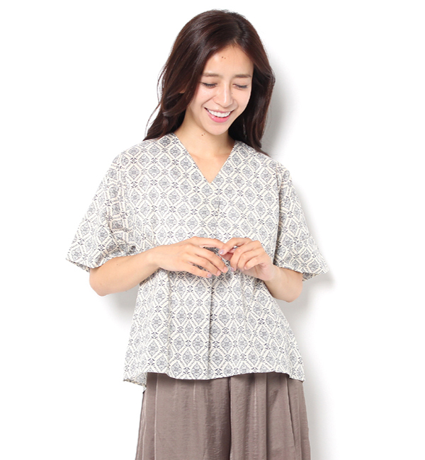 【3000円(税込)以上で送料無料】 モダンな雰囲気漂う小紋柄のプリントデザインで、大人顔に仕上げたプルオーバーブラウス。シャープなVネックがフェイスラインをすっきりと見せ、フロントタックが着こなしにメリハリをプラス◎定番デニムとのカジュアルコーデはもちろん、フレアスカートと合わせたレディライクな着こなしもおすすめです。 サマンサモスモス/Samansa Mos2 トップス|シャツ・ブラウス