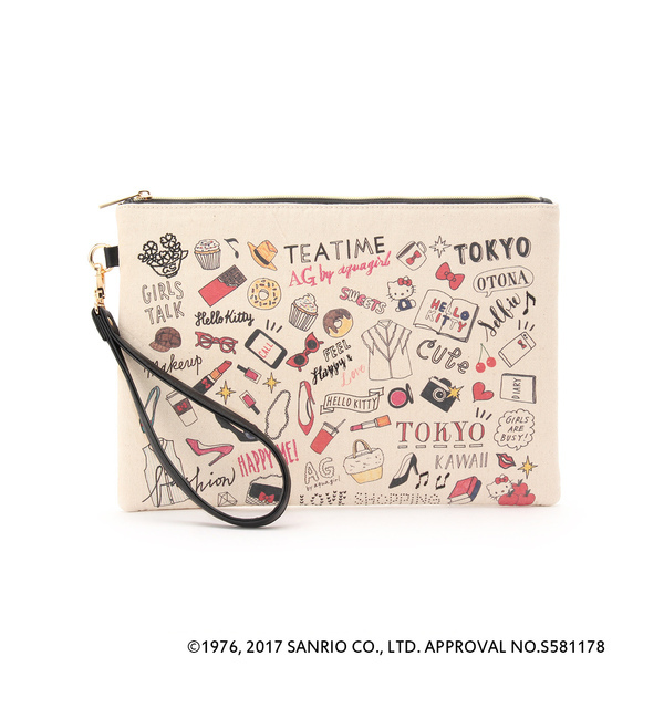 【3000円(税込)以上で送料無料】 人気のイラストレーター Shogo Sekine さんデザインによるAG by aquagirl オリジナルデザイン。アクセサリーやスイーツなど、女子が大好きなアイテムをめいっぱい描いたクラッチ。ストラップが付いており、ハンドバッグとしてもお使いいただけます。内側ポケット×3店舗へのお問い合わせ商品番号:C12-03177 AG バイアクアガール/AG by aquagirl AG by aquagirl|バッグ|クラッチバッグ