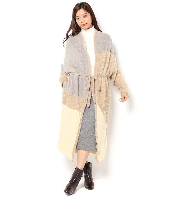 【送料無料】 異素材ミックス×カラ-ブロックでコーディネートのアクセントになるコーディガン。ブークレー糸とショートシャギー糸がソフトで着心地が良い素材です。共ベルト付でガウンのように着ていただけ、今年らしいシルエットです。 ライチ/ライチ アウター|その他