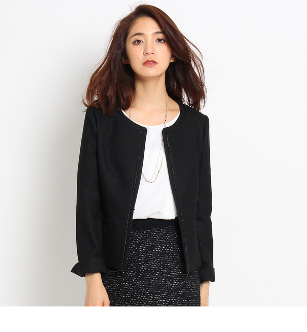 【送料無料】 シングルカラーでシンプルにデザインしつつも、艶めくブレードテープアクセントで、ニュアンスを効かせたジャケット。ベーシックなノーカラーフォルムで、合わせやすく幅広いシーンでの活躍が期待できます。パンツなどともコーデバランスの取りやすい、コンパクトな着丈も◎サイズ違いの商品もご用意しております。R:127-42039 L:127-42704モデル情報:身長172cm B80 W60 H85 着用サイズ:38店舗へのお問い合わせ商品番号:127-42603主に春に着用いただける商品です。 日本製 インディヴィ/INDIVI INDIVI|ジャケット・スーツ|ノーカラージャケット