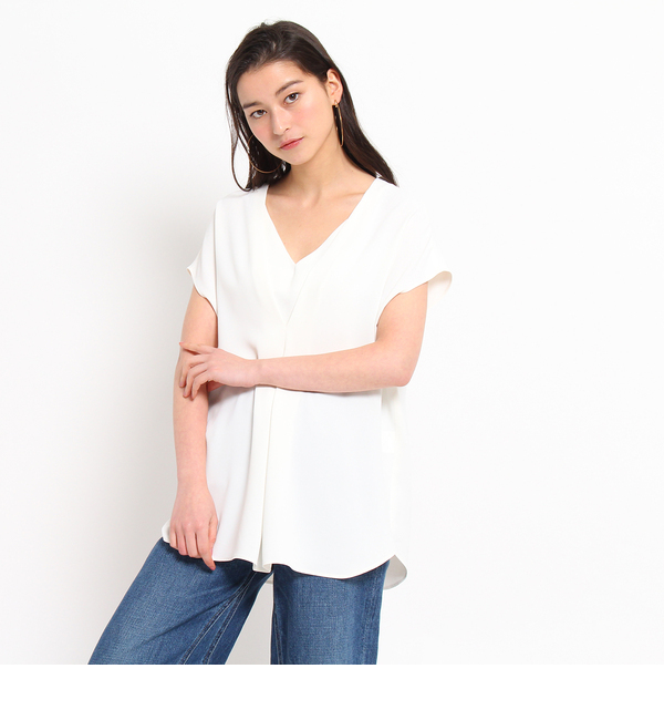 【3000円(税込)以上で送料無料】 テロンとした落ち感のある生地で仕上げたプルオーバーブラウス。大きく開いたVネックが今年らしいデザインです。フロントのタックがシルエットをこなた表情に。着丈が長めなので、ワイドなベルトをマークした今年らしいスタイリングがお洒落に決まります。モデル情報:身長163cm B83 W63 H88 着用サイズ:38(M)店舗へのお問い合わせ商品番号:162-82023主に夏に着用いただける商品です。 中国製 オゾック/OZOC OZOC|トップス|シャツ・ブラウス