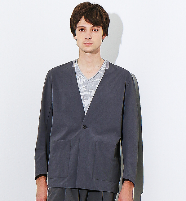 【送料無料】 タテ・ヨコ共に伸縮性に優れた素材を使用、やや薄手でコシがあり、ナイロン特有のさらっとした肌ざわりが特徴です。デザインはノーカラーで首元をすっきりさせ、カジュアルなコーディネートがしやすいジャケット。また【撥水加工】、【接触冷感】などの機能性も備わる素材は、梅雨時期から秋まで活躍してくれます。同素材セットアップ ショートパンツあり。model:H185 B88 W74 H92 着用サイズ:L マイセルフ アバハウス/MYSELF ABAHOUSE MYSELF ABAHOUSE|ジャケット・スーツ|ノーカラージャケット