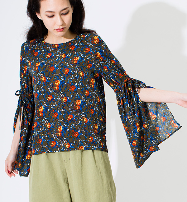 【送料無料】 ヴィンテージライクな小花柄ブラウスで、旬のレトロボヘミアンを堪能♪ふわっと広がるベルスリーブにはスリットを入れ、華奢見えも期待できちゃいます。生地に洗いをかけた凸凹とした風合いは、肌触りも軽く、よりノスタルジックなムードを盛り上げて。デニムでカジュアルダウンしても、プリーツスカートでガーリーにもハマる、今季のワードローブのキーアイテムです。 オズモーシス/OSMOSIS トップス|シャツ・ブラウス