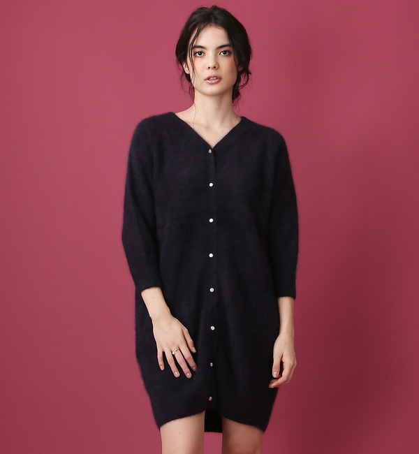 【送料無料】 【大人気のため追加生産決定!】ふわふわの糸を使ったニットワンピース。前後2wayで着られるところや、フェミニンで女性らしい雰囲気が毎年大人気のアイテムです。ボタンを背中にしてニットワンピースとして着るときは、背中がVにアイテム大人の色気を演出。ボタンを前にして着るときは、ロングカーディガンとして着るのがおすすめ。コンビネゾンやパンツスタイルなど、ボーイッシュなアイテムに羽織るだけで、女度をぐっとあげてくれます。いまの時期からは、コートのインナーなどに着てもアウターに響かないのでおすすめです。(キャメル・ブラック)model:H166・B80・W59・H86 着用サイズ:FREE(ネイビー)model:H170・B84・W62・H90 着用サイズ:FREE ルージュ・ヴィフ ラクレ/Rouge vif la cle FONCE|トップス|カーディガン