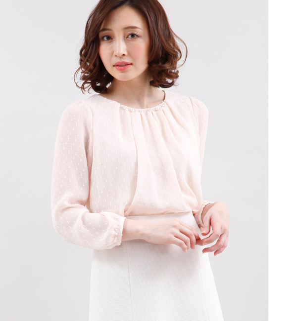 【送料無料】 透け感のあるシースルー素材を使用した上品なカットソーです。単品使いはもちろん、ブルゾン、ジャケットなどをプラスしたスタイルもネック部分のモチーフがアクセントになります。短め丈感で、すっきりとした印象のため、どんなボトムとも相性が良く着こなすことが出来ます。・裏地あり ・水洗い可 マルシェ ド クリアインプレッション/MARCHE de CLEAR IMPRESSION CLEAR IMPRESSION|トップス|Tシャツ・カットソー