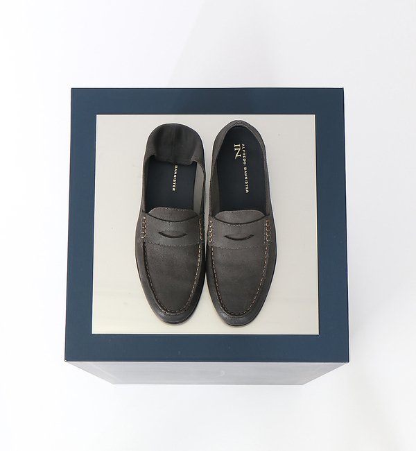 【送料無料】 ミュール感覚で履ける2WAY仕様ローファー・使い回しの効くベーシックデザイン・ミュールとしても履ける2WAYデザイン・履き心地追究したインナー仕様【BLK/WIN】肉のしっかりした牛皮革の吟を擦りあげ、靴にしてからバフやWHTWAX、シュークリームで仕上げた素材を使用。【GRY】オイルと染料で鞣しあげたベロアを使用。リラックススタイルをキーワードに、デザインをまとめたローファー。踵の芯を抜くことで、ミュールとしても履けるように、編集した1足。履き口の裏には、ブランドカラーでもあるNAVのテープを施し、補強の役割と、足に引っかかるようなフィティング感を持たせました。インソールは、中底に中反発材を引き、その上に低反発材の全敷きを引く事で、クッション性を高めました。先裏に吸湿速乾性の生地を採用しました。サイズ感について ・コンバースやナイキなどといったスニーカーと比較してもおおよそ0.5cm?1cm程大きく作られております。Ex.コンバースで27.0cmを履かれている方は、SIZE:42(26.0cm)程度とお考え下さい。※履き方・足型等、個人差はございますので、あくまでも参考程度にお考え下さいませ。 アルフレッド・バニスター/alfredoBANNISTER alfredoBANNISTER|シューズ|スニーカー