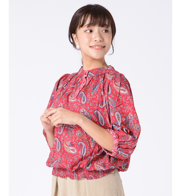 【送料無料】 しなやかなレーヨン素材の七分丈ブラウス。ほどの良い存在感のペーズリー模様が全体に散りばめられています。スタンド風カラーと、袖口とバックのボタン部分に別布を使用しているのがアジアンなテイストを醸し出し、裾にシャーリング加工が施されているのでウエスト位置を高く、全体をほっそりと見せる効果があります。 カスタネ/Kastane トップス|シャツ・ブラウス