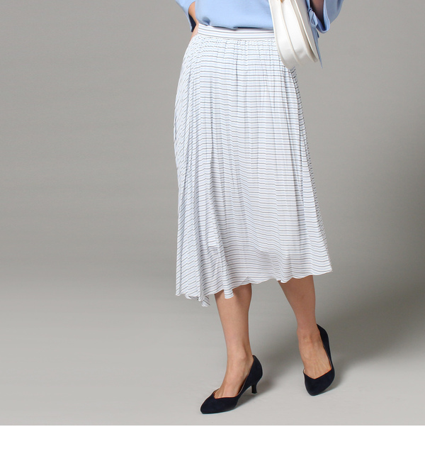 【送料無料】 アクセントカラーを効かせたストライプ見えのプリーツスカートです。半円に近いパターンにプリーツ加工を施すことによって左側はボーダー見え、右側はストライプ見えする遊び心を感じるデザインに。また裾をアシンメトリーなヘムラインにすることで全体に動きを出しているのもポイントです。サイズ違いの商品もご用意しております。R:153-74311モデル情報:身長166cm B80 W59 H86 着用サイズ:02店舗へのお問い合わせ商品番号:153-74911主に春に着用いただける商品です。 アンタイトル/UNTITLED UNTITLED|スカート|スカート