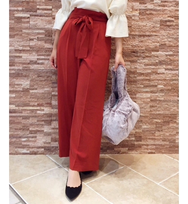 【送料無料】 マットな質感のサテン生地で仕立てたとろんとした落ち感が綺麗なハイウエストパンツの登場。ウエストはバックギャザーが施され程よいフィット感で着用でき、同素材のベルトを結ぶと大人可愛いアクセントに◎トップスをinすると脚長効果抜群のハイウエストシルエットパンツは今年らしいコーデのマストアイテムです♪[レッド]*摩擦や水濡れによる色落ち・色移りにご注意下さい。 ペルルペッシュ/Perle Peche パンツ|その他
