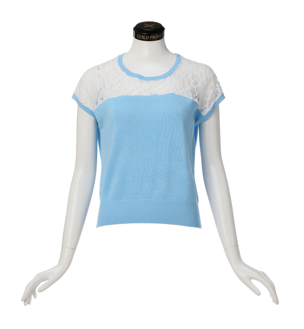 【送料無料】 繊細なレースとハイゲージニットを組み合わせたフェミニンな印象のプルオーバーニット。明るいカラーのニットと爽やかなオフホワイトのレースにより、清涼感があり、夏場まで着用出来る一着です。二の腕を気にしない安心感のある袖付きのデザインも、このアイテムの魅力。素材には、柔らかいレーヨンコットンの糸を使い、肌触りが良く着心地もバツグンです。トルソー:H172 B80 W58.5 H86 着用サイズ:36 ギルドプライム/GUILD PRIME トップス|ニット・セーター