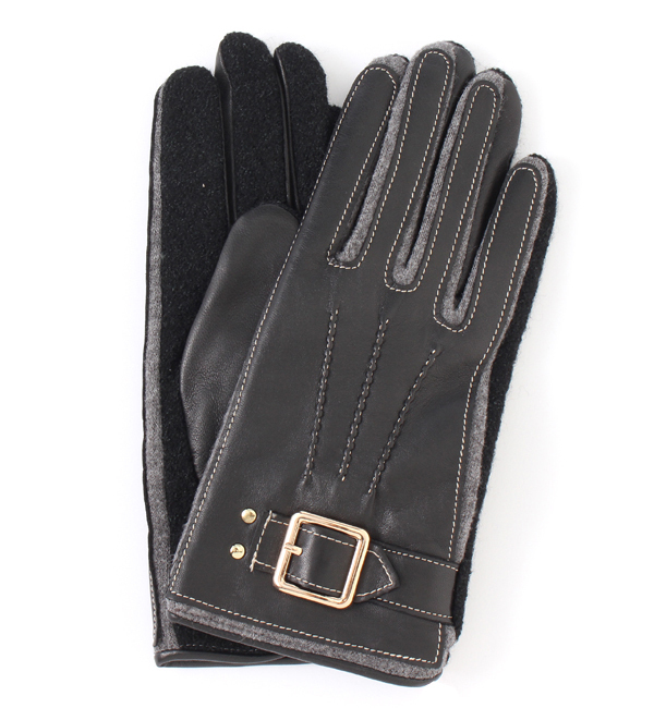 【送料無料】 人気のレザーコンビグローブに今季の新作が登場!今年は手首までしっかり覆う長さになりました。シンプルですっきりとしたデザインの中に、手首の大ぶりのバックルがポイントになっています。指のサイドは、ダークカラーのレザーをコンビ使いにして、スマートでおしゃれな雰囲気を演出しています。手のひら側は電導ジャージなので、付けたままでもスマートフォン操作ができます。 トプカピ/TOPKAPI 小物|手袋