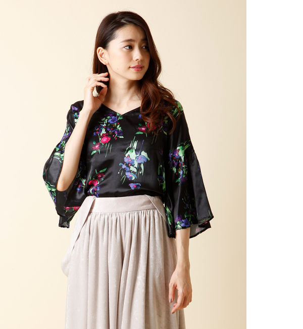【送料無料】 女性らしさ溢れるフラワーデザインの袖コンシャスなブラウスは、今シーズンぜひとも押さえておきたいアイテムです。ワイドに広がるベルスリーブがレディライクな印象を引きたててくれるのも魅力的なポイント。同素材のスカートと合わせてセットアップとしても着用して頂けます。・裏地なし ・バックボタン付き ・水洗い可 エフデーゼ/EFDEISEE ef-de L|トップス|シャツ・ブラウス